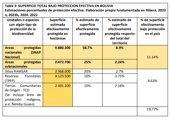 Según el documento, solo el 19,77% de la superficie de Bolivia está efectivamente protegida. Y, desglosando por tipos de áreas, establece que sólo el 58,7% de la superficie de áreas protegidas nacionales está efectivamente protegida.
