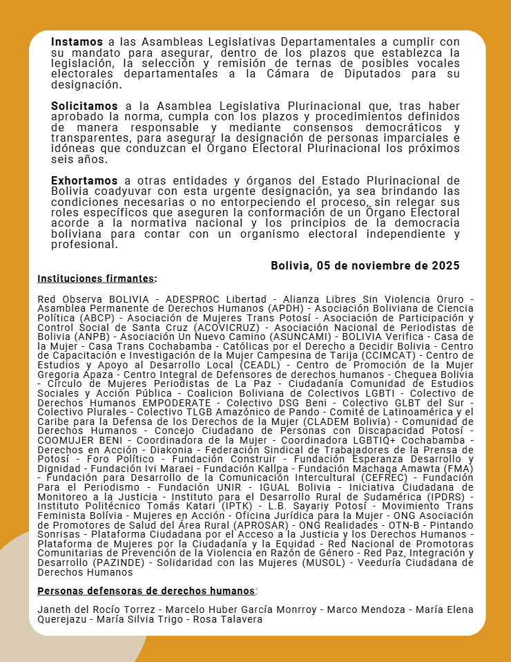 «Exhortamos a la nueva Asamblea Legislativa Plurinacional a priorizar el tratamiento y aprobación de la Ley de convocatoria y selección de vocales electorales, generando certidumbre sobre el funcionamiento del Órgano Electoral Plurinacional sin prórrogas ilegales e inconstitucionales», señala un pronunciamiento firmado por 62 organizaciones y seis personas defensoras de derechos humanos.