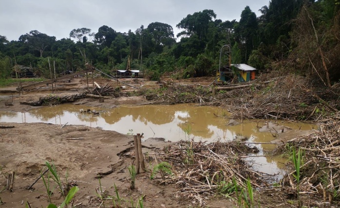 Las imágenes y reportes confirman, según la nota, la presencia de dragas y maquinaria operando no solo en el cauce, sino también devastando los márgenes del río y lechos antiguos provocando contaminación irreversible y deforestación de la selva.