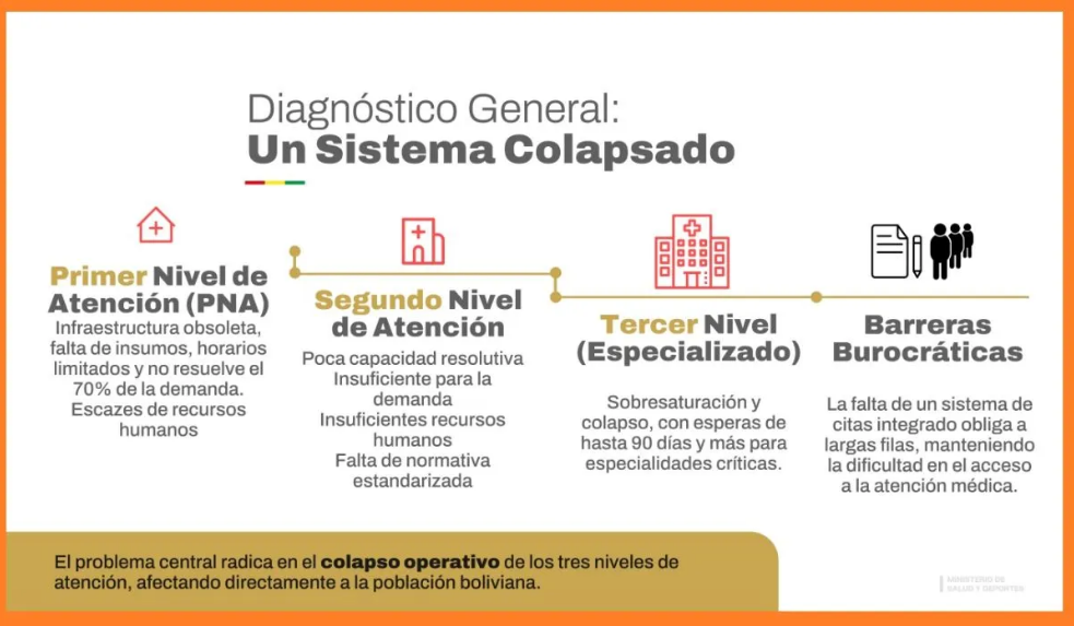 “(La ministra de Salud, Tatiana Flores) explicó que, a partir de un análisis exhaustivo del sistema sanitario, se evidenció que en la gestión pasada el sector atravesaba dificultades estructurales severas, caracterizadas por problemas financieros, legales y operativos, deudas millonarias acumuladas y una profunda fragmentación del sistema de salud”, señala un boletín de prensa.