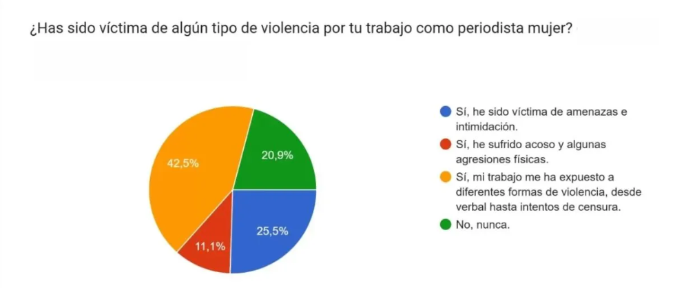 Estos datos muestran que la violencia vinculada al ejercicio periodístico afecta a una parte importante de las mujeres que trabajan en medios de comunicación en el país.